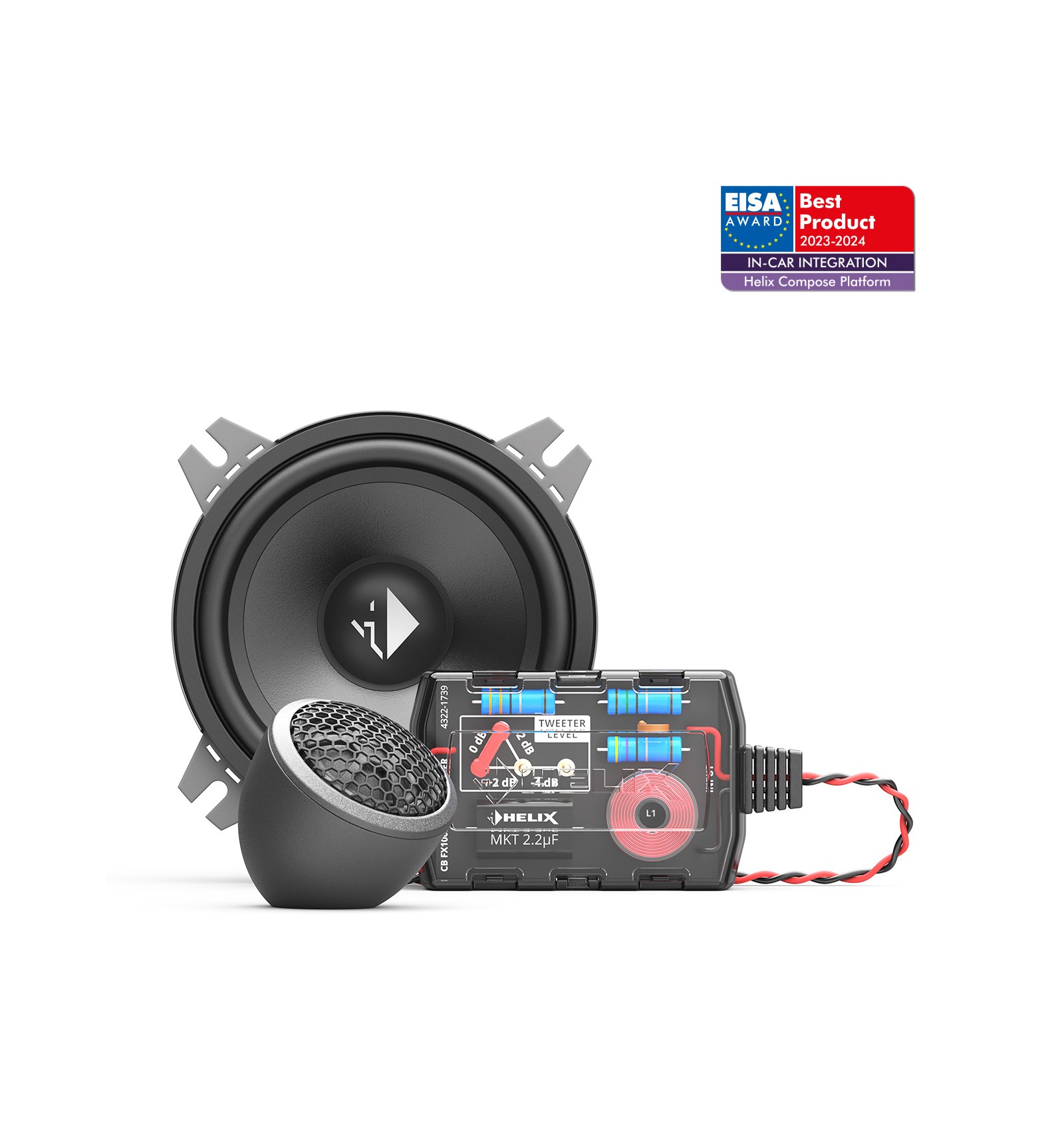 Crossover-ul de înaltă calitate include filtru trece-înalt pentru tweeter cu pantă de 12 dB/octavă și protecție integrată. Reglajul nivelului tweeter-ului în 4 trepte permite adaptarea precisă a înaltelor în funcție de poziția de montaj și de preferințele personale, pentru un sunet perfect echilibrat.